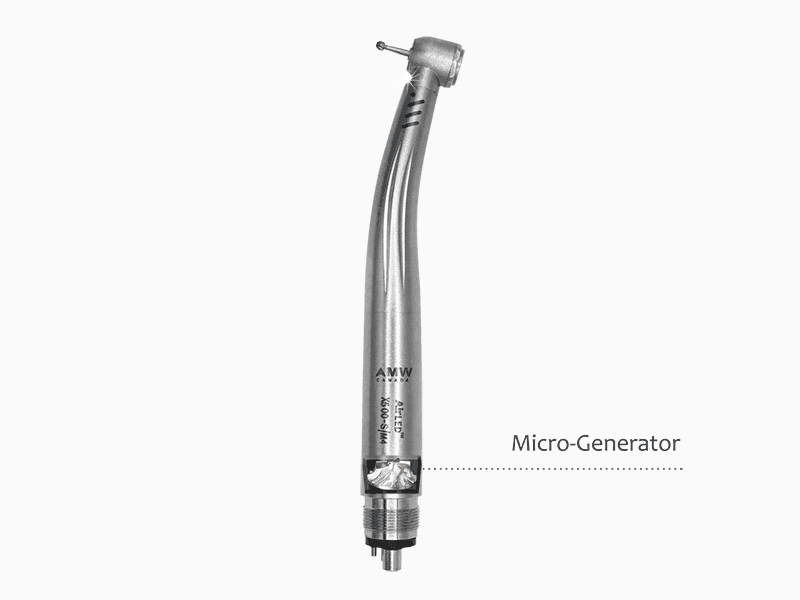 A built-in micro-generator provides consistent power to the LED light directly within the handpiece, eliminating the need for external fiber-optic systems.