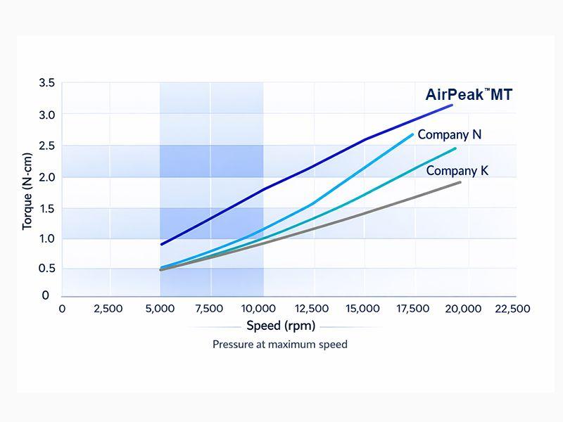 AirPeak™ MT proporciona un par potente y estable incluso a bajas velocidades, funcionando hasta 20 000 rpm. Su innovadora tecnología de dinámica de fluidos ofrece casi el doble de par que los motores tradicionales de baja velocidad, que operan entre 5000 y 10 000 rpm.